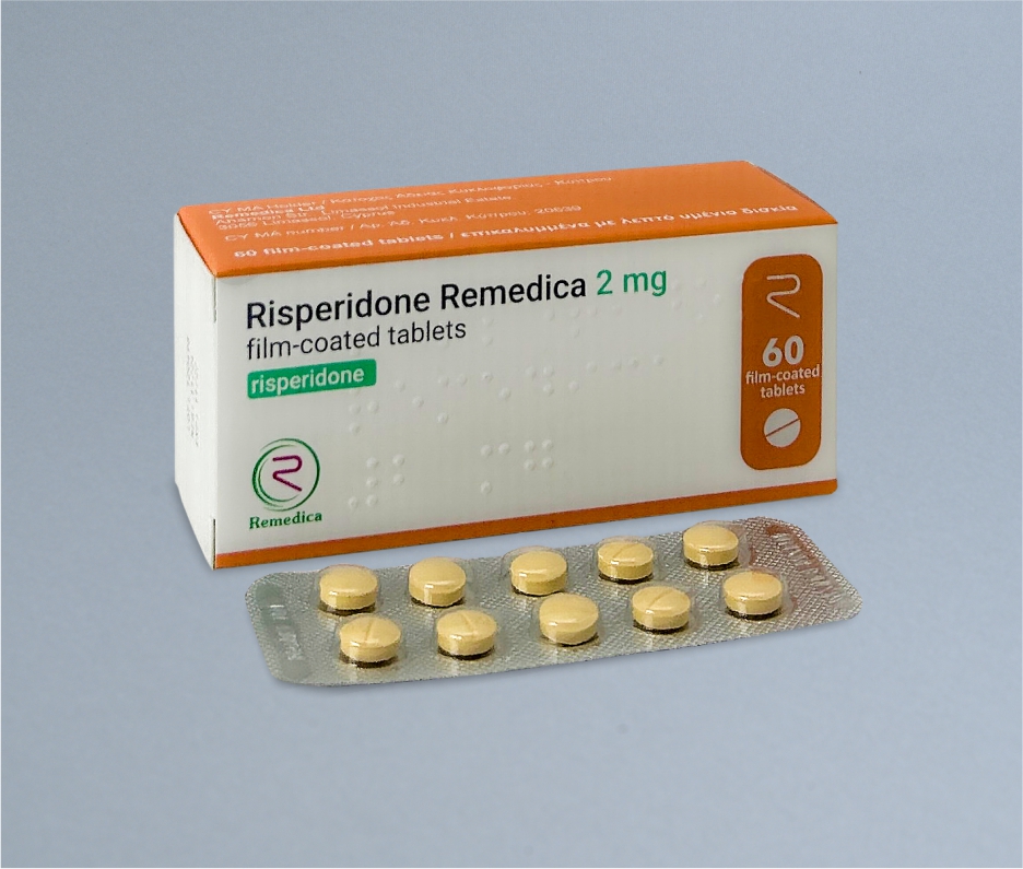 Risperidone-Remedica 2mg – 10 light peach, f/c tablets with break line on one side in a blister. 10 blisters (60 f/c tablets) in a cardboard box along with a leaflet.