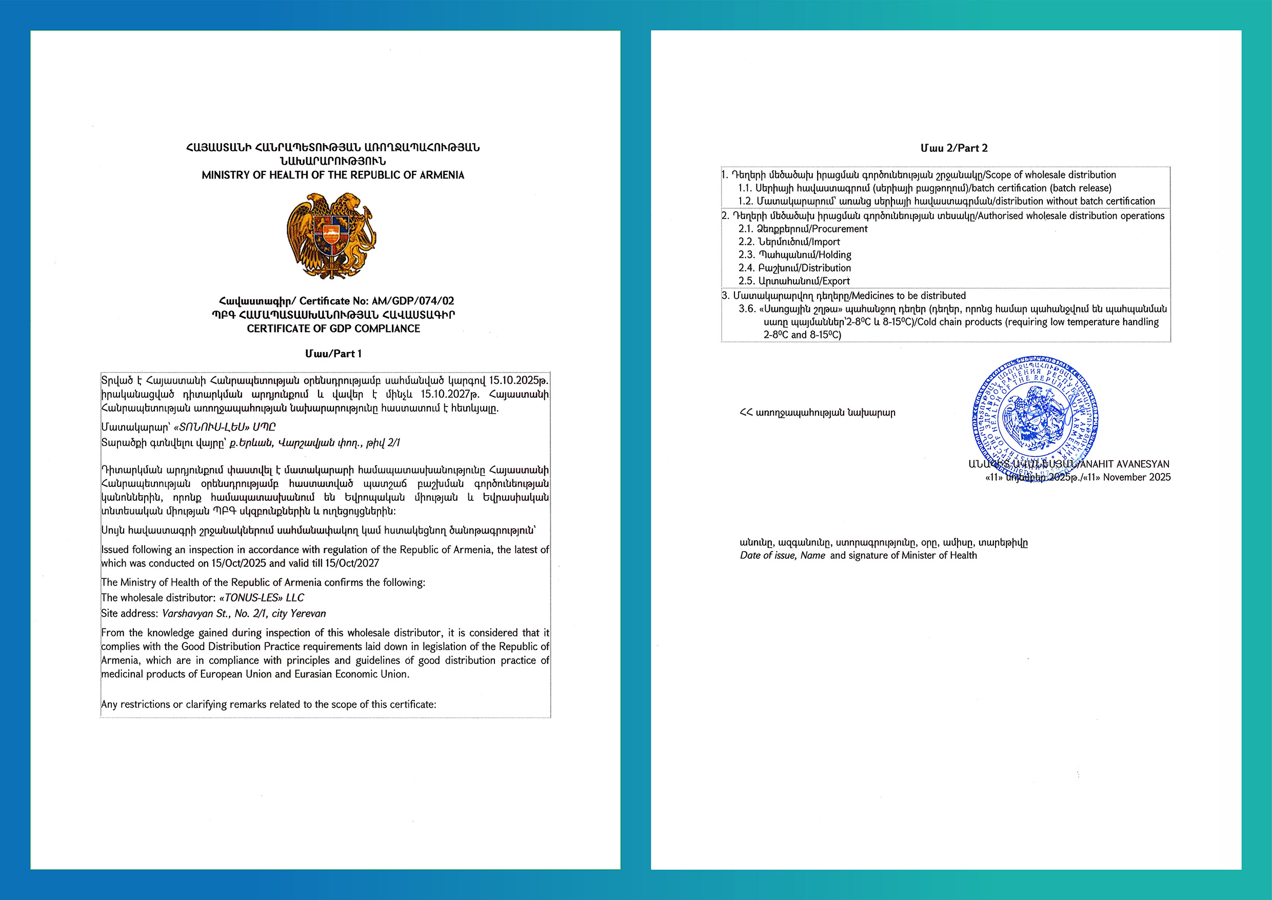В 2019 году компания „Тонус-Лес“ расширила складские ресурсы для хранения фармацевтической продукции за счет строительства новых и модернизации всех складских помещений в соответствии с международными требованиями GDP. Новые склады позволяют хранить импортированную, производимую и поставляемую фармацевтическую продукцию в полном соответствии требованиям как в масштабном, так и в техническом отношении. Предусмотрены три отдельные контролируемые температурные зоны: 2-8°C, 8-15°C и не более 25°C, в соответствии с условиями хранения, определенными для отдельного фармацевтического продукта. Компания одной из первых в Республике Армения успешно прошла процесс лицензирования оптовой дистрибьюции лекарственных средств. С 2024 года компания получила от Министерства здравоохранения РА сертификат соответствия требованиям Надлежащей дистрибьюторской практики (GDP).